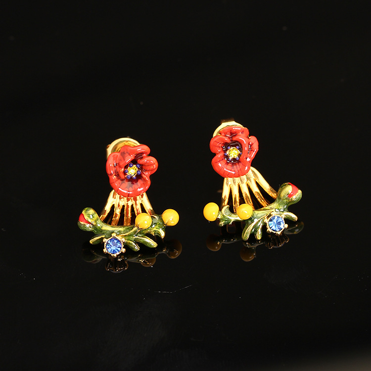 Red Enamel Flower Zircon Earrings Jewelry Stud Earrings