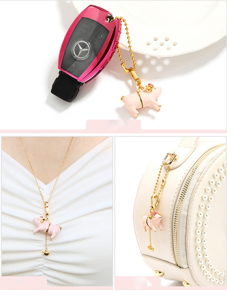 Pink Pig With Bow Enamel Necklace Key Pendant With Two Chains