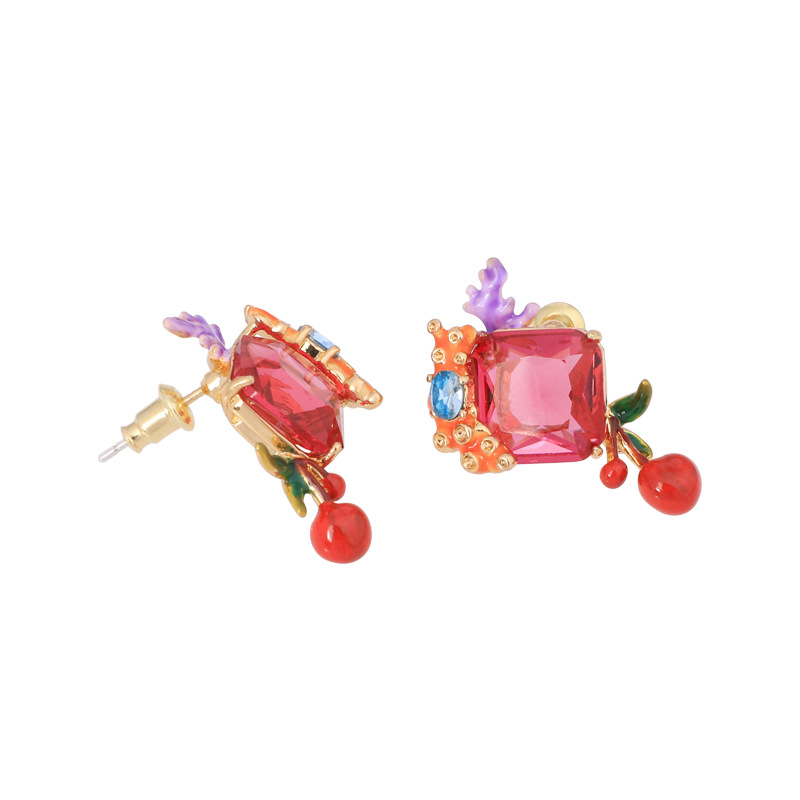 - Pink Gem Cherry Enamel Earrings Jewelry Stud Clip Earrings