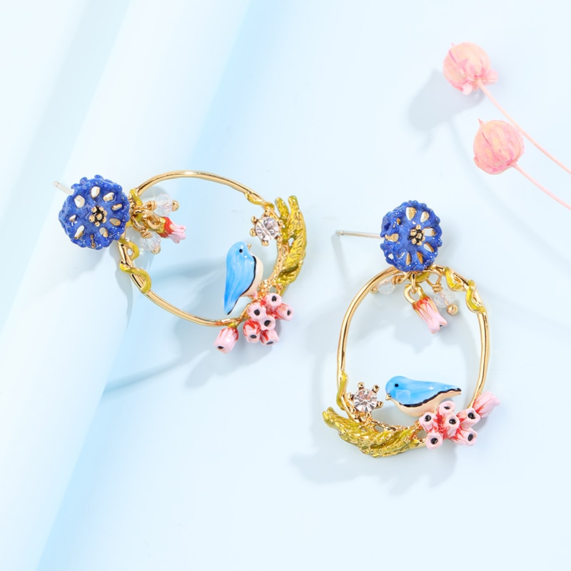 This pair of earrings for women combines a big shaped hand-carved stone and ladybug and caterpillar on a branch with two beautiful flowers. All elements of this piece of jewelry are made in 18-carat gold-plated brass and are hand enameled, respecting Dangerose' pure creation tradition.